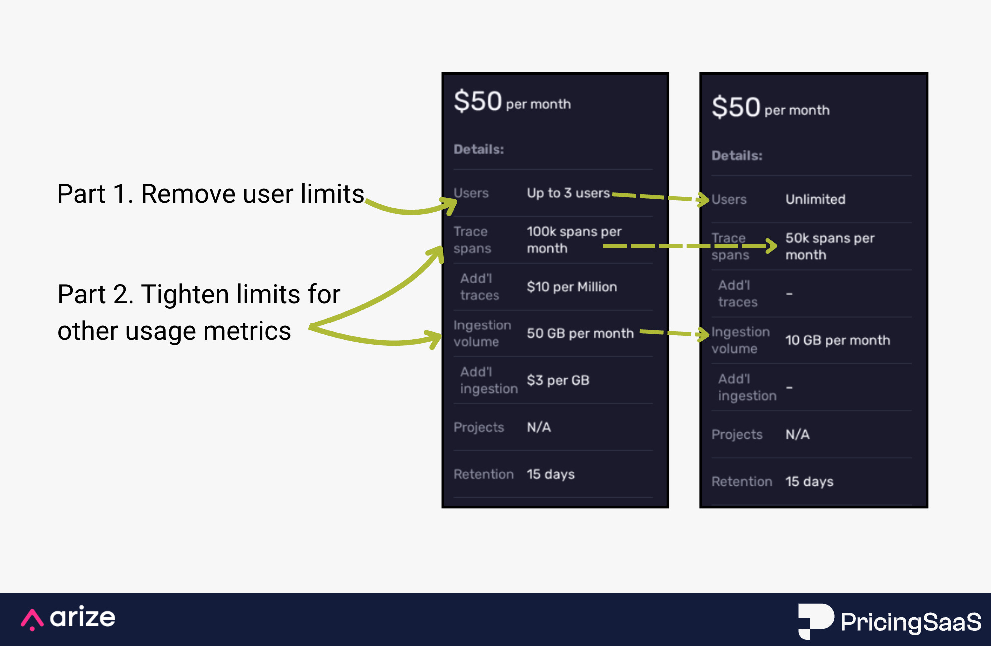 By removing user limits, Arize made it easier for teams to add stakeholders to the product. More users leads to more traces, higher ingestion, and faster paths to hitting real usage thresholds. It’s a move to drive both activation and monetization.