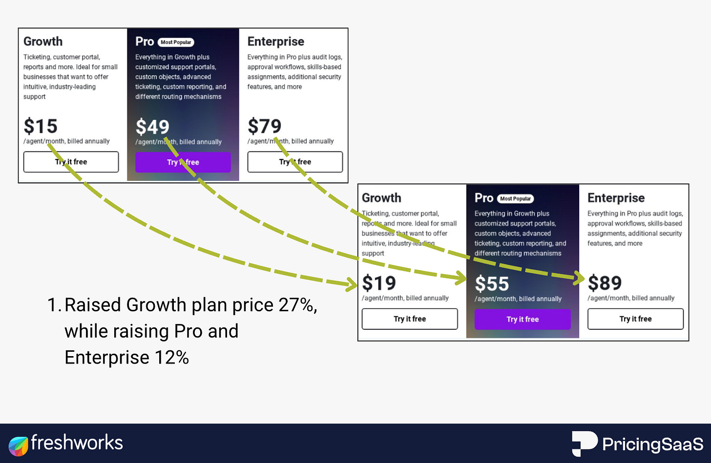 Freshworks raised prices across all three plans, but not evenly. The Growth plan went up ~27%, while Pro and Enterprise increased closer to ~12%.