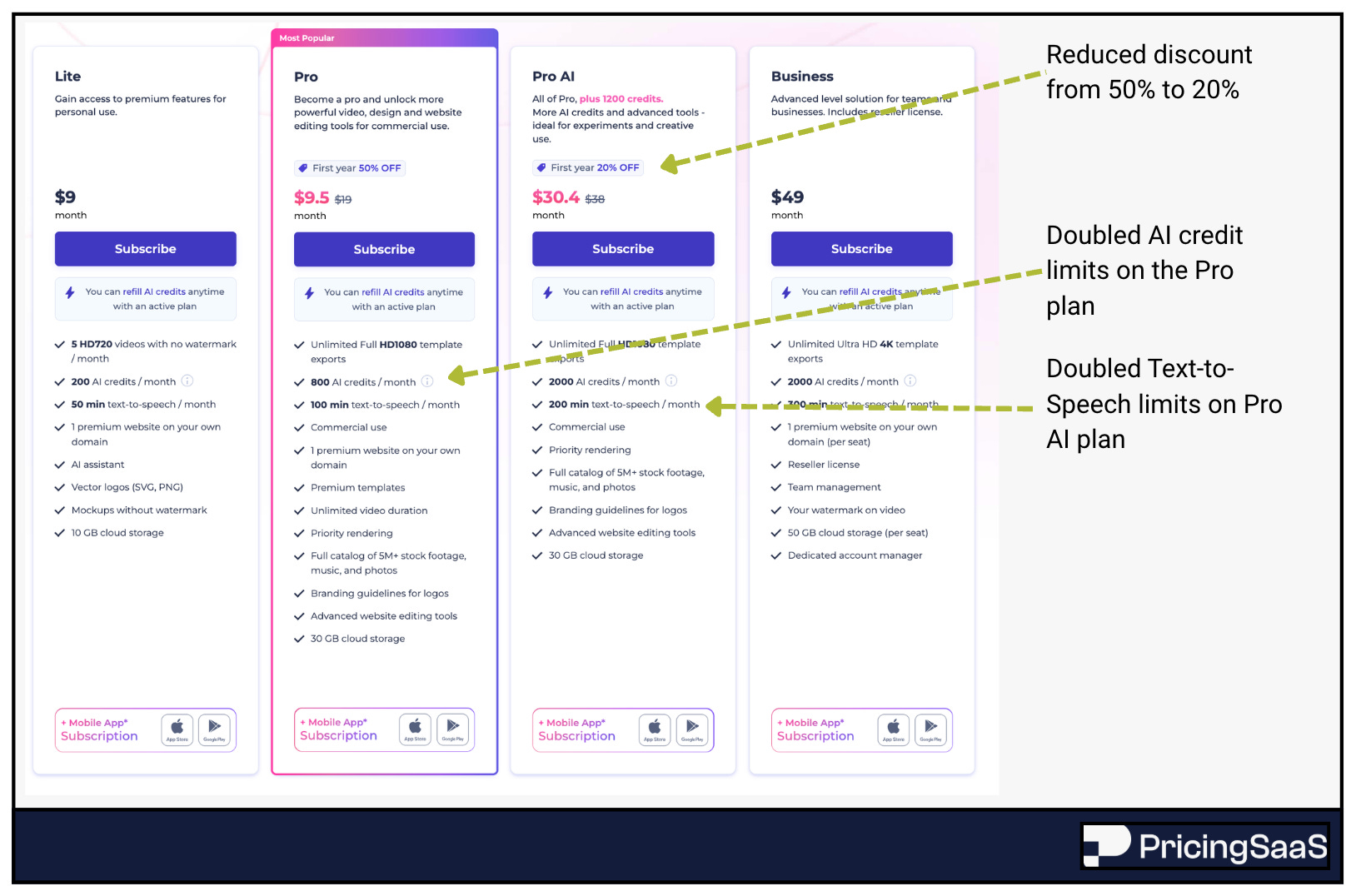Renderforest made a series of moves to differentiate the Pro plan from the Pro AI plan. Combined, these moves suggest they’re looking to drive conversion to Pro and change how they differentiate AI across plans. Here’s what they did:
