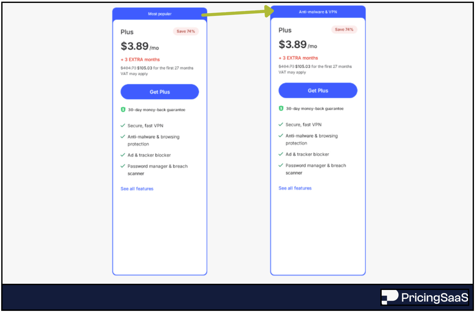 The “Most Popular” or “Recommended” banner is a staple of SaaS pricing page design, but NordVPN added an interesting spin. The banner for the Plus plan changed from “Most Popular” to “Anti-Malware & VPN.”