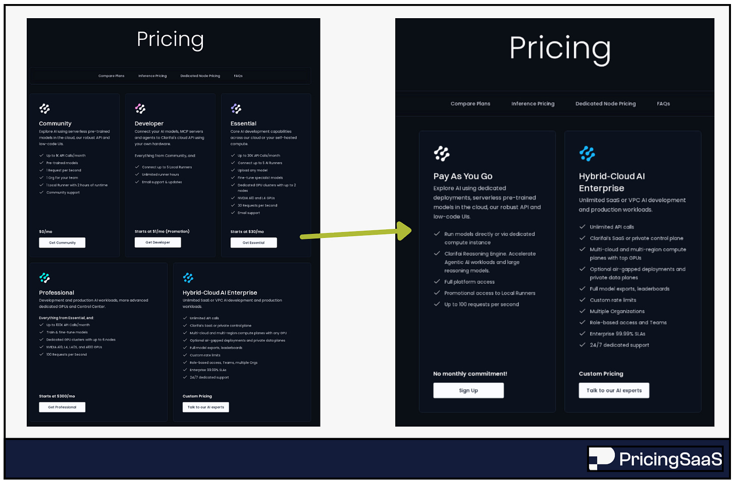 Clarifai reduced its plan mix, consolidating from 5 plans down to 2. They replaced the Community, Developer, Essential, and Professional plans with a single Pay-as-you-Go plan. The update removes all usage thresholds and monthly commitment requirements, and drastically simplifies the decision-making process for new customers.