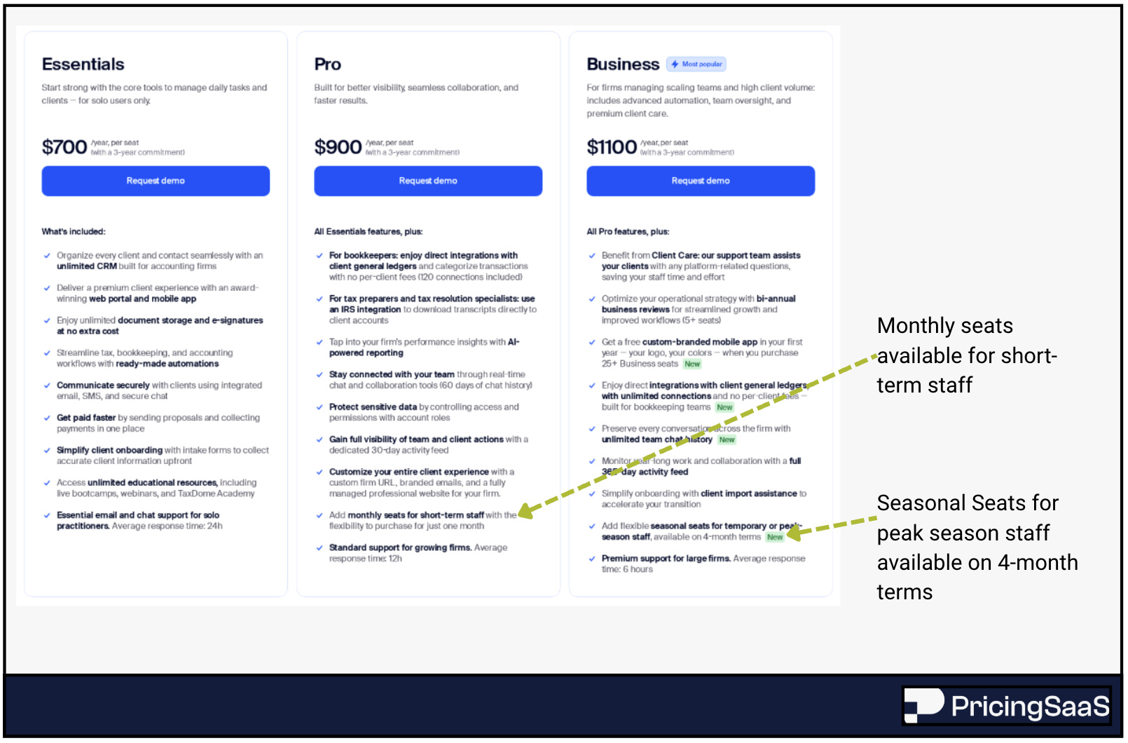 On the Pro plan, customers could already add temporary staff at $100/user/mo. Now Business plan customers can add Seasonal Seats for $500/user for 4-months.