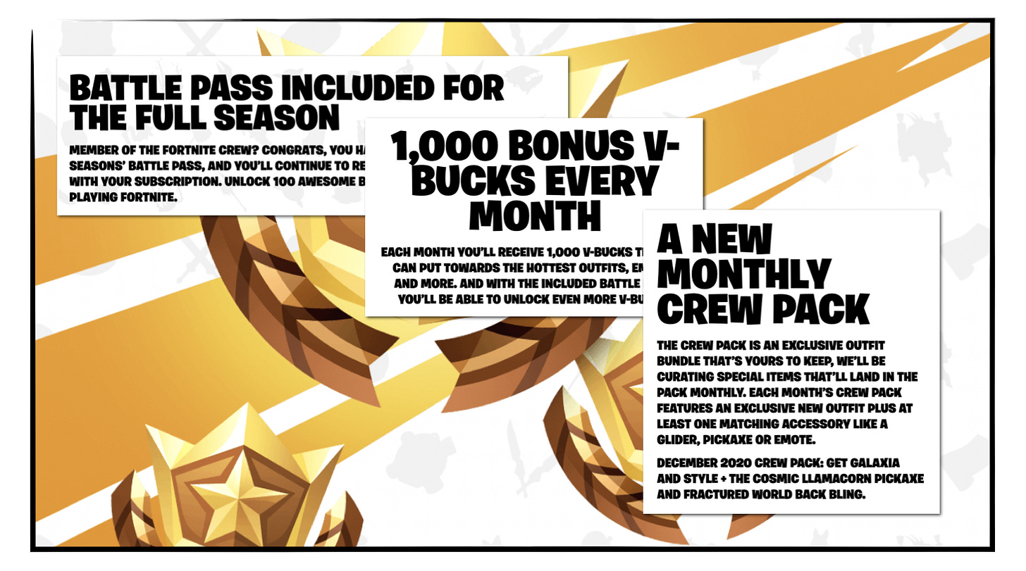 The Crew Pack also gives Fortnite a recurring digital drop-strategy, fueling marketable moments that can drive new subscriber growth and keep the subscription fresh for existing subscribers.