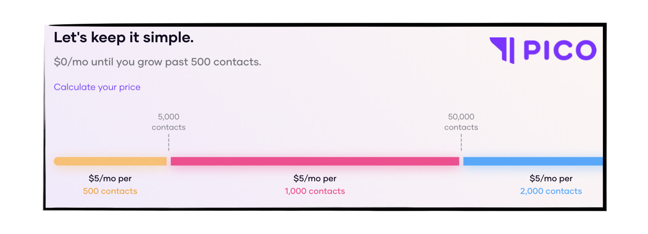 Pico, on the other hand, has no monthly cost and only a 5% transaction fee until a customer reaches 500 subscribers, at which point they start charging $5 per month per 500 subscribers.