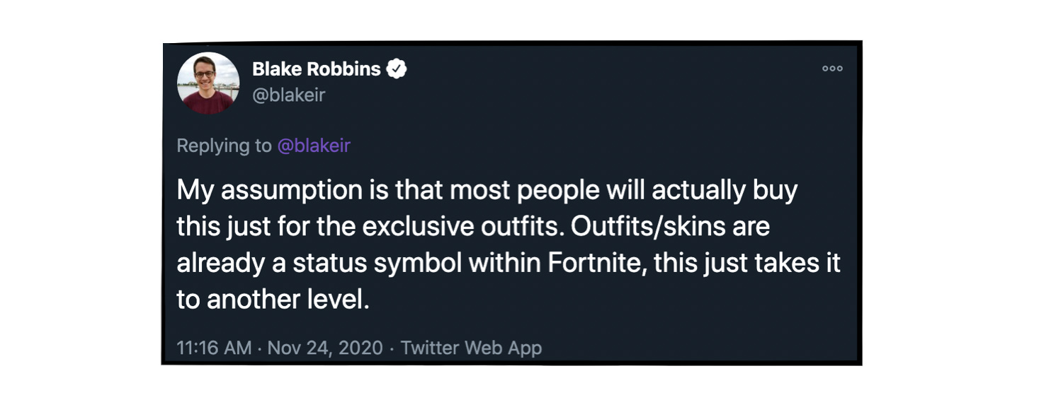 Also worth noting - exclusive outfits are a sign of status within Fortnite. Players wearing free skins/outfits often get bullied into spending money to avoid being called defaults. As Blake Robbins of Ludlow Ventures tweeted, many will likely subscribe for the status perks of the outfits alone.