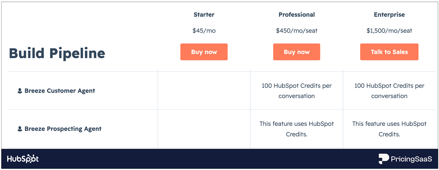 A few weeks ago, I highlighted two examples of agent packaging: Notion and Hubspot [link]. Both companies bundle agents into their higher tiers, and use a credit system to monetize usage.