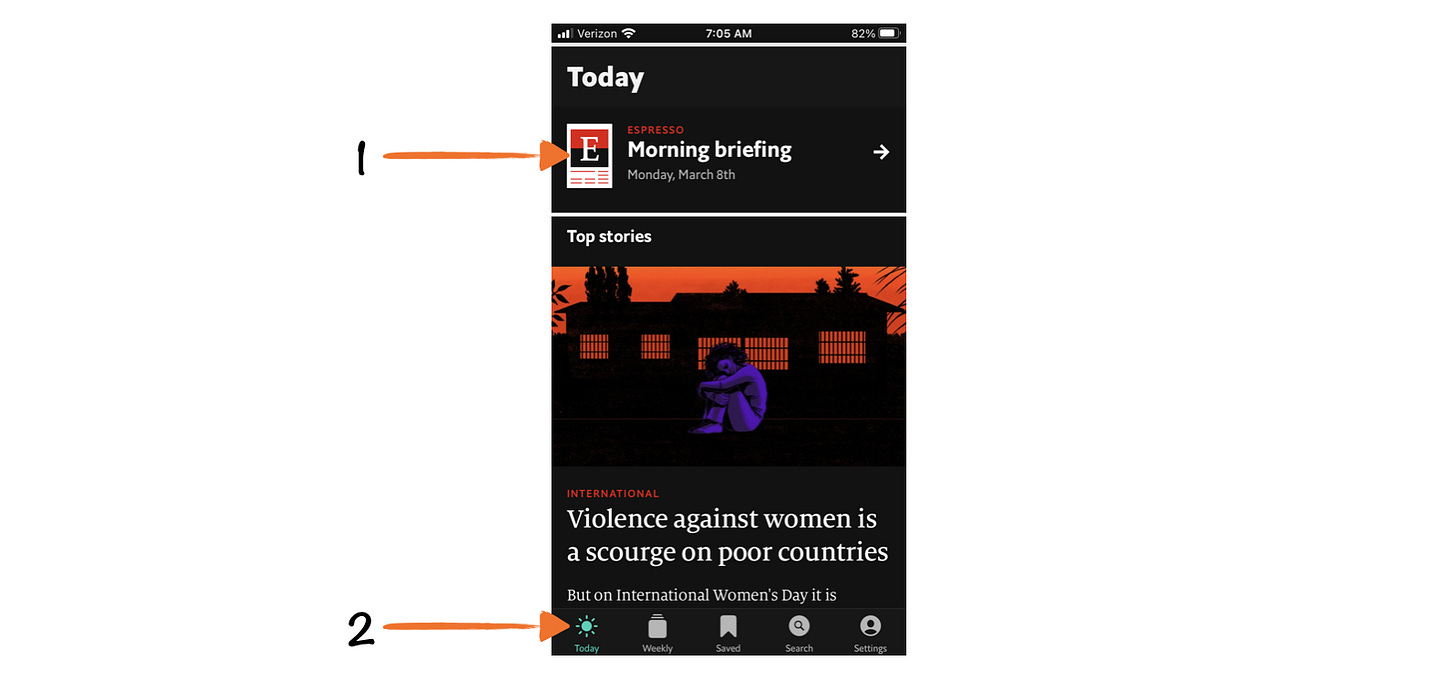 In this context, upon opening The Economist app, the first thing you'll notice is a callout to Espresso at the top of the screen: