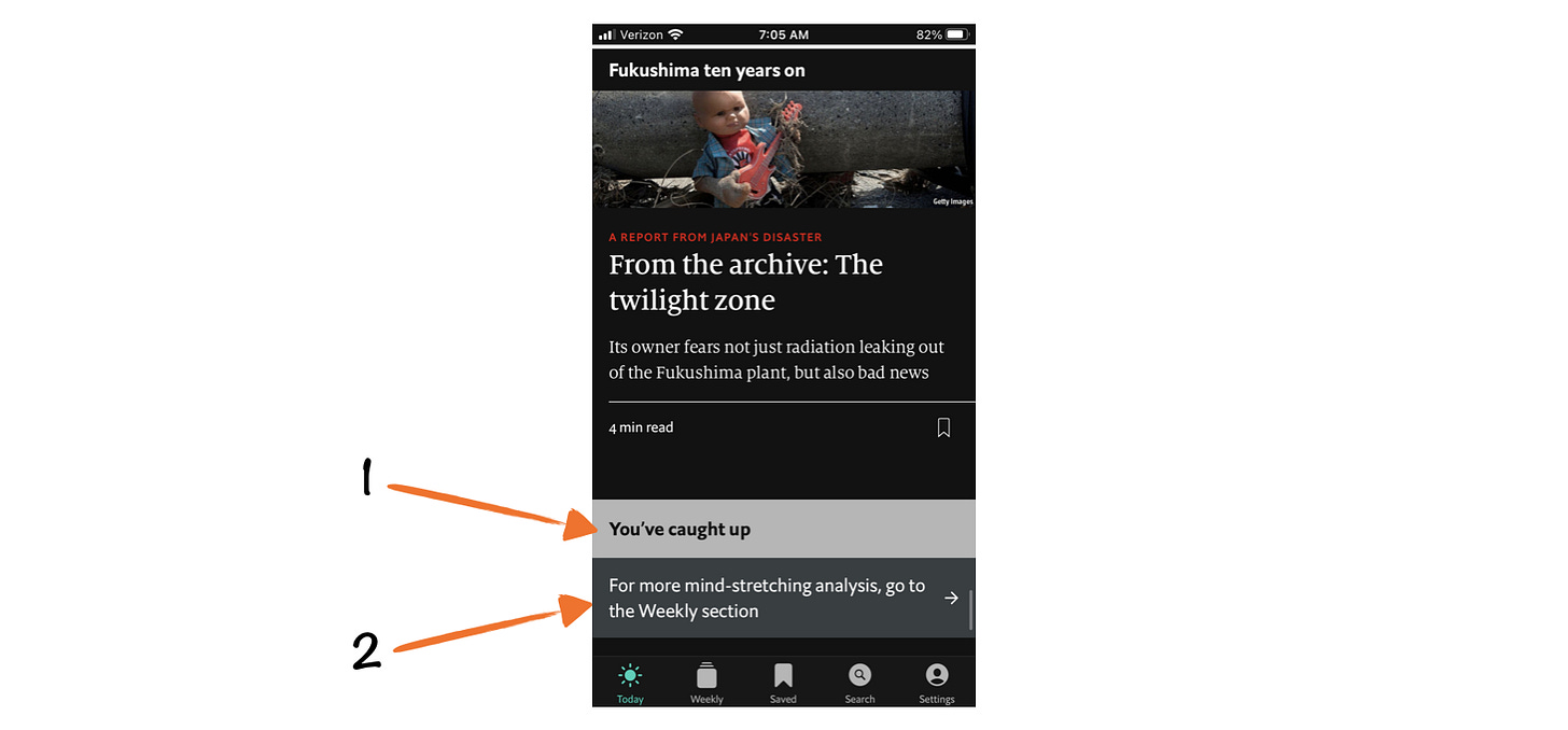 Along with attracting new readers who are too price-sensitive for the flagship subscription, it also provides a safety net for existing subscribers to fall back on if they find the full subscription to be too exhaustive. However, after seeing the success of Espresso, The Economist team took reader exhaustion head-on by making curation a staple of the flagship app as well.
