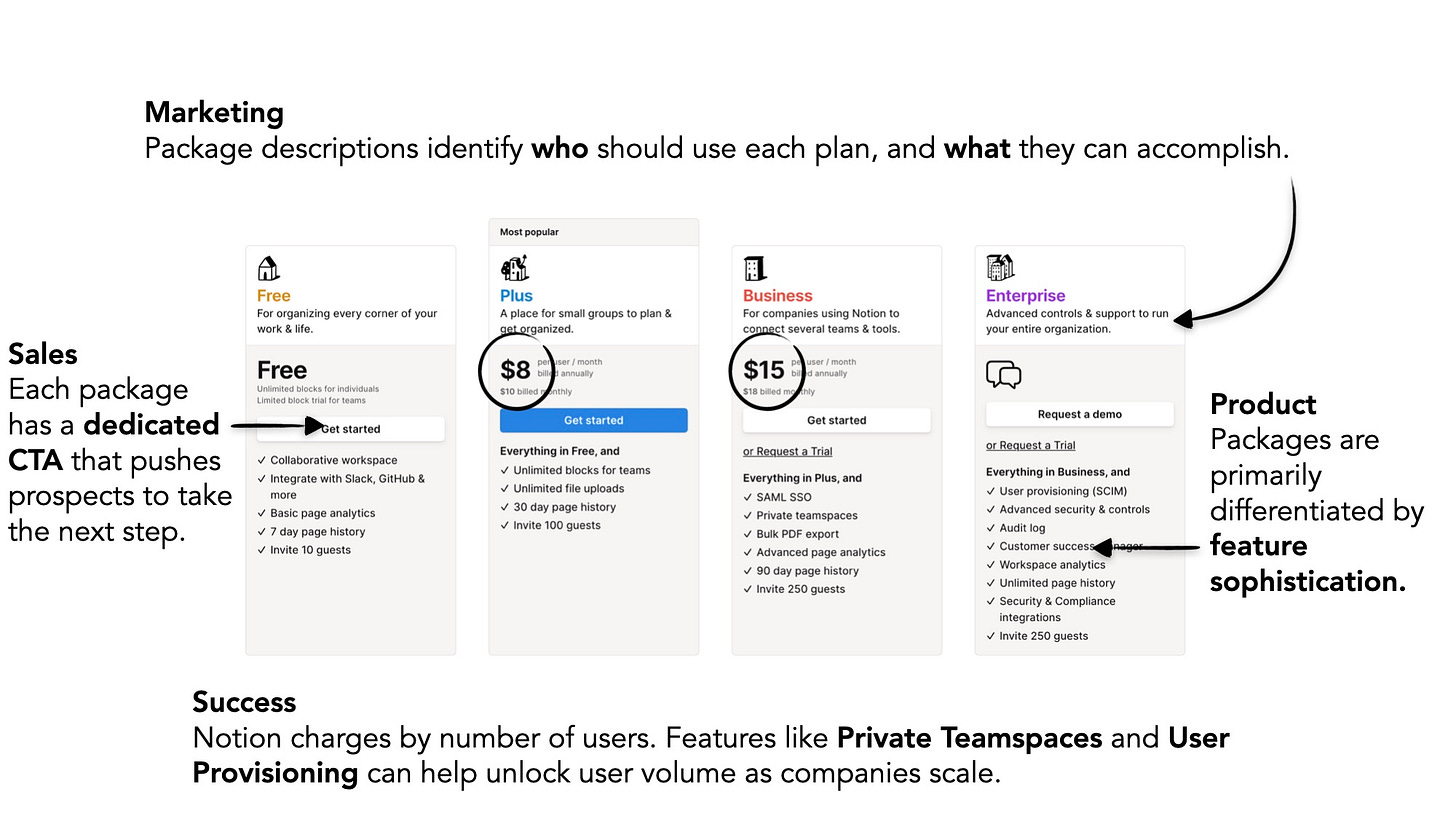 Each package should have a clear CTA so an interested prospect can take the next step. Depending on the package, that CTA can range from “Get Started” to “Start a Trial” to “Contact Sales.”