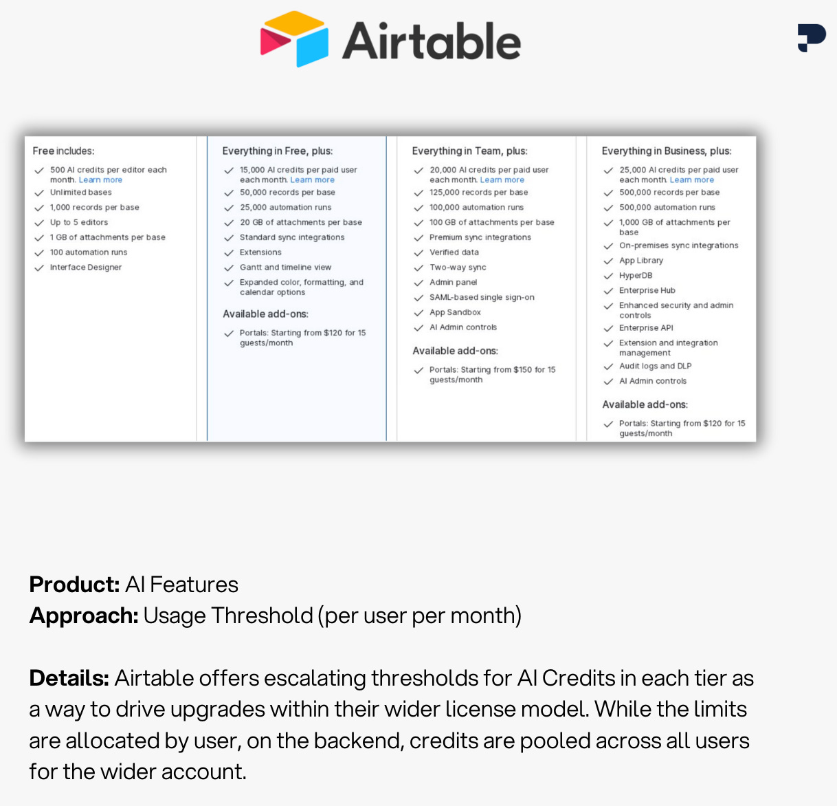 Airtable and Asana use this approach, bundling escalating credit thresholds within traditional seat-based license tiers.