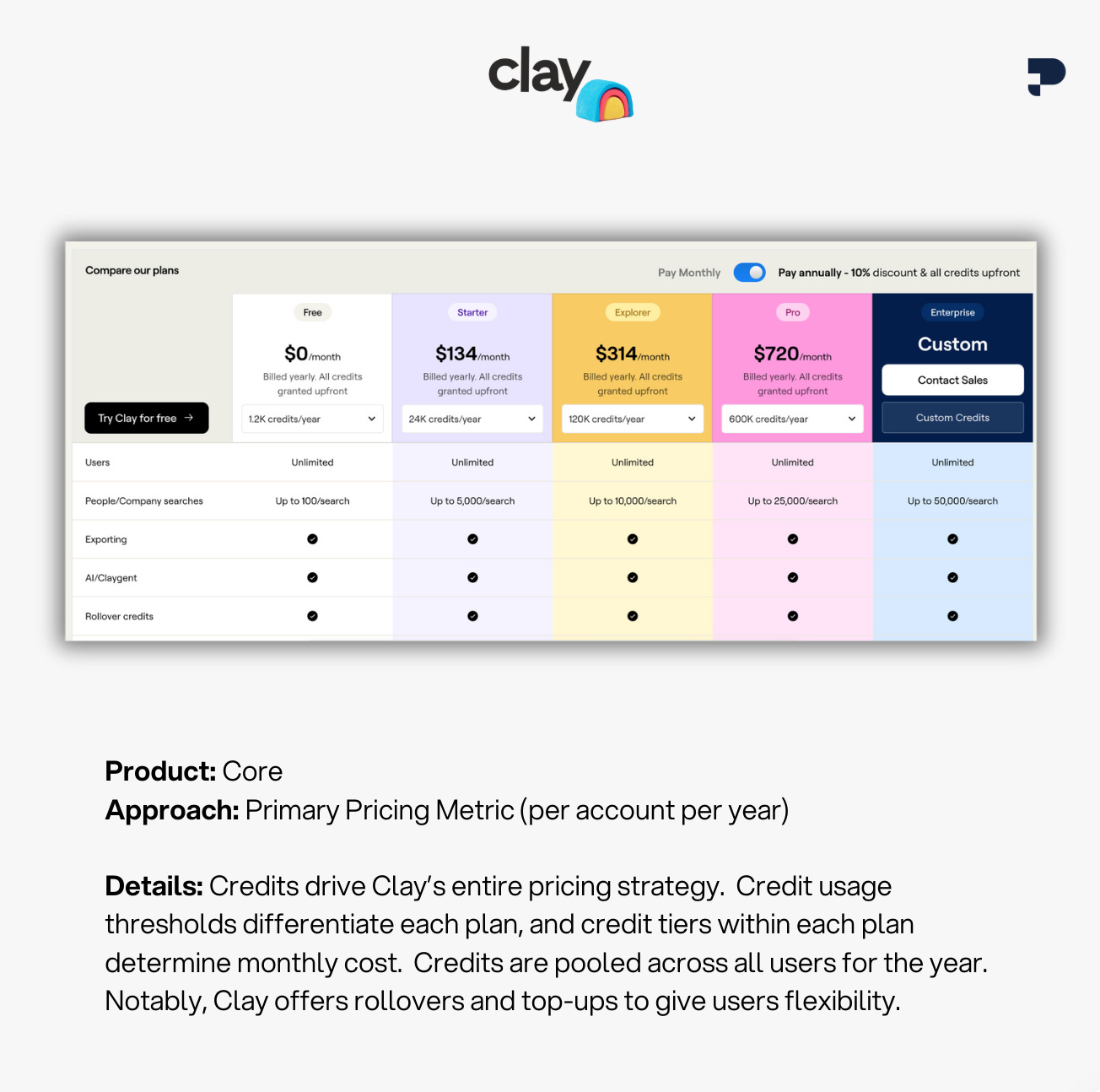 Clay's entire pricing strategy revolves around credit usage thresholds: different credit volumes determine plan tiers, and credits pool across all users annually with rollovers and top-ups for flexibility.