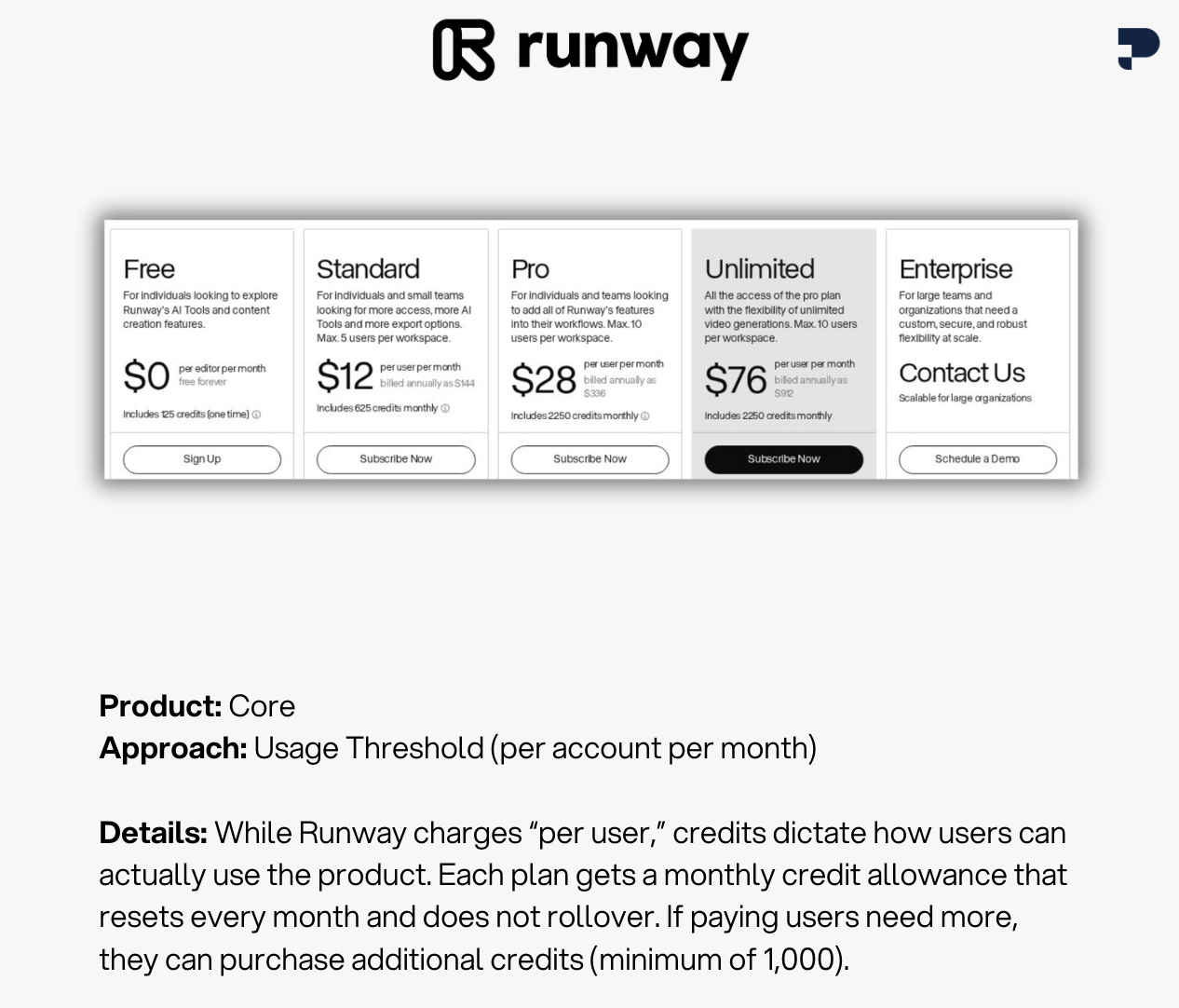 Runway takes this approach. Each tier has a per user cost, with a credit allocation that defines how much customers can use the product. Each plan includes monthly credit allowances that reset without rollover, with additional credits available for purchase.