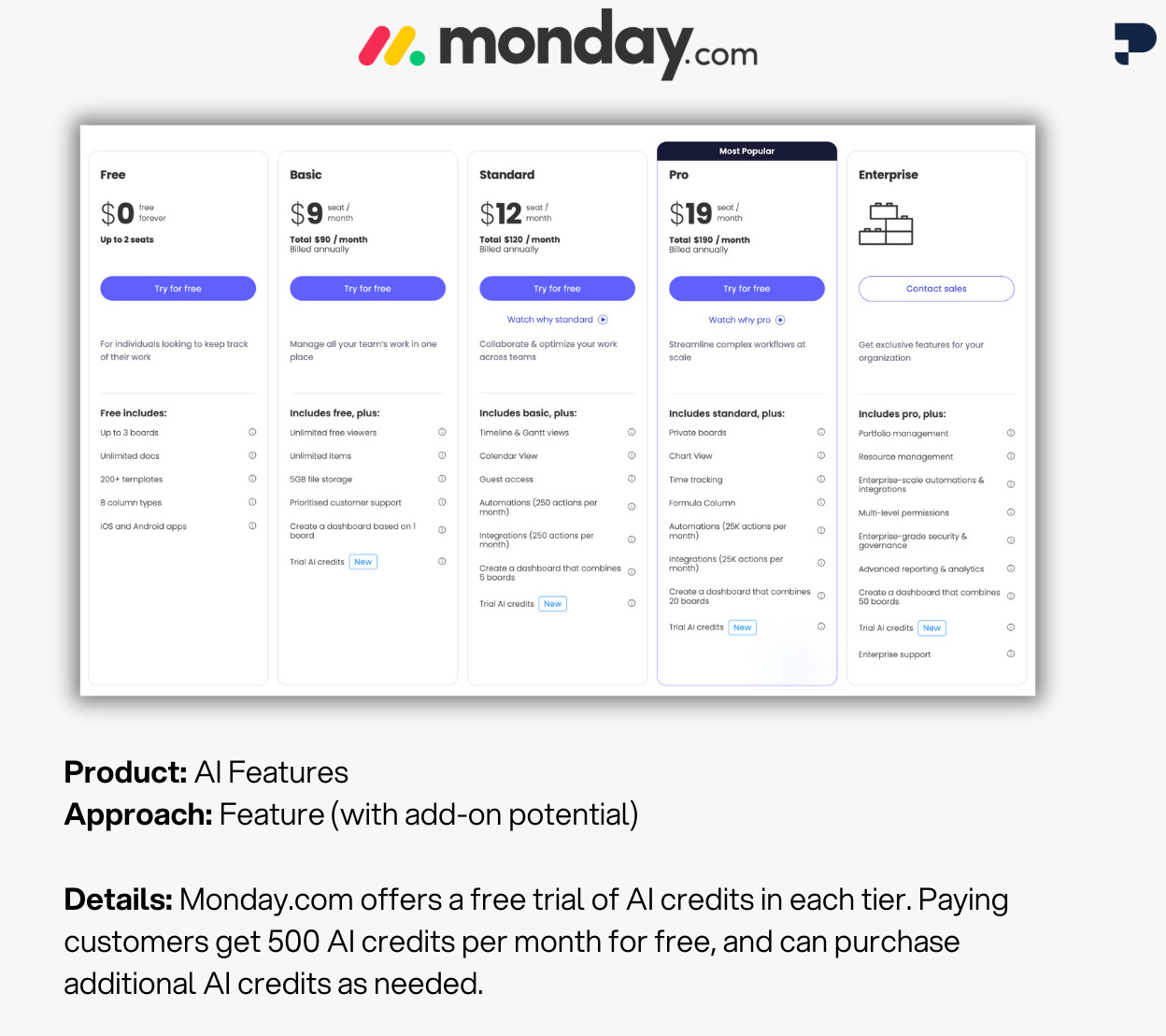 For example, Monday.com gives all customers 500 AI credits per month for free, with the option to buy more as needed.