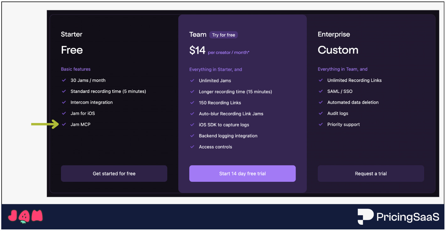 Their MCP allows AI coding assistants to read complete, structured context from Jams to debug faster. Jam’s free plan is limited to 30 Jams, so similarly to Zapier, its easy to see a user blowing through that limit, especially if their team is using Claude code for debugging (a popular use case).