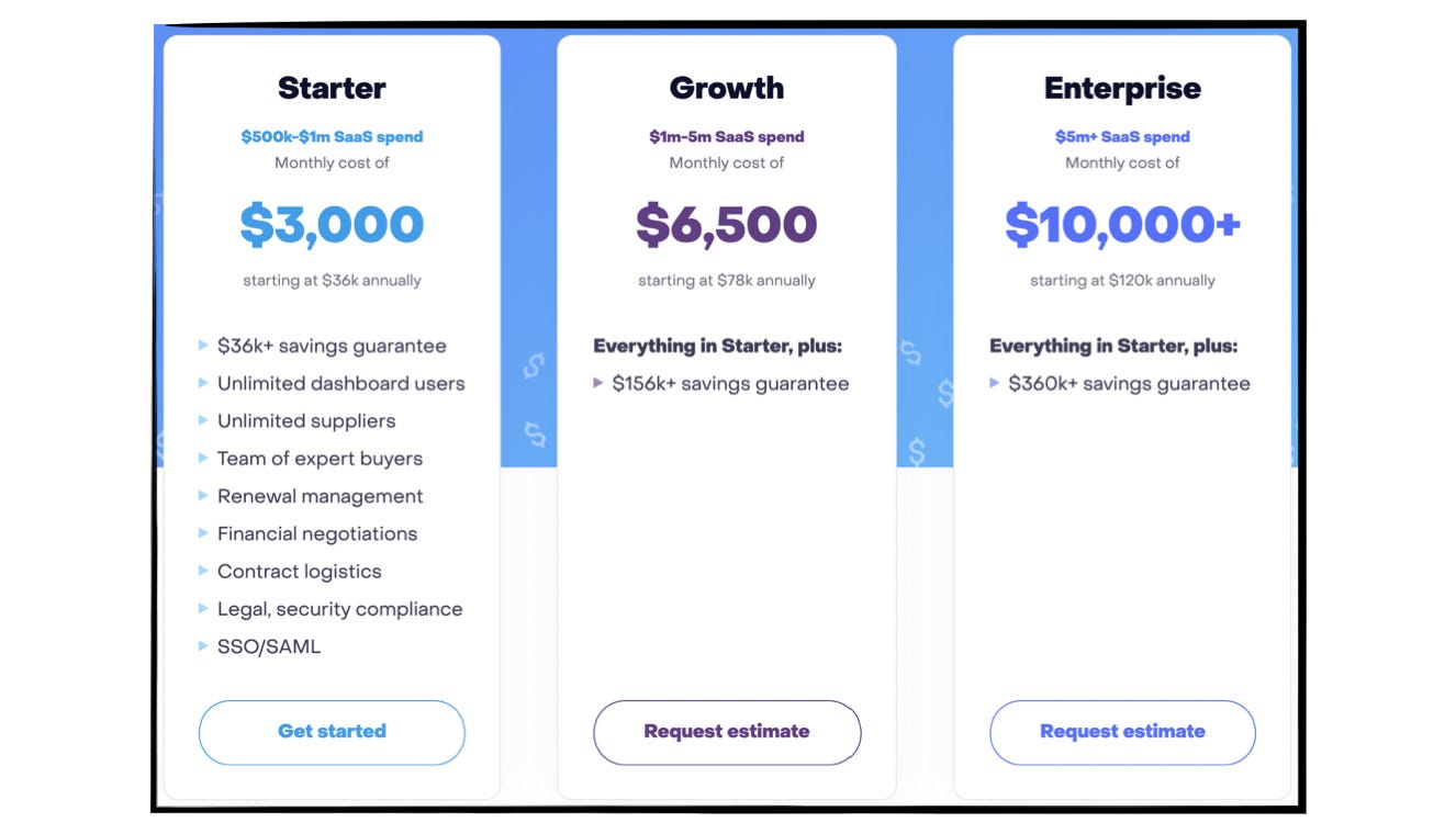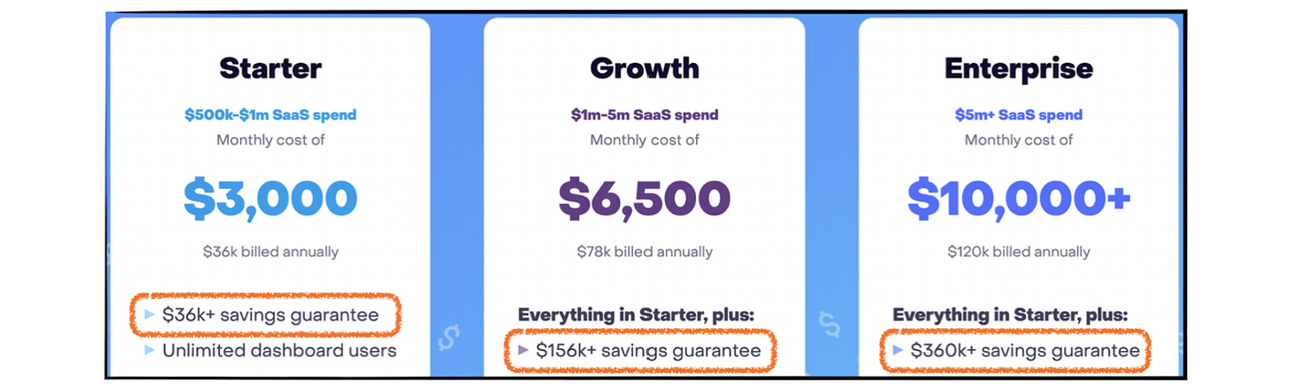 With Starter, they guarantee savings of $36k or 1x the annual cost of Vendr. With Growth, they guarantee $156k or 2x the cost, and with Enterprise they guarantee $360k or 3x the cost.